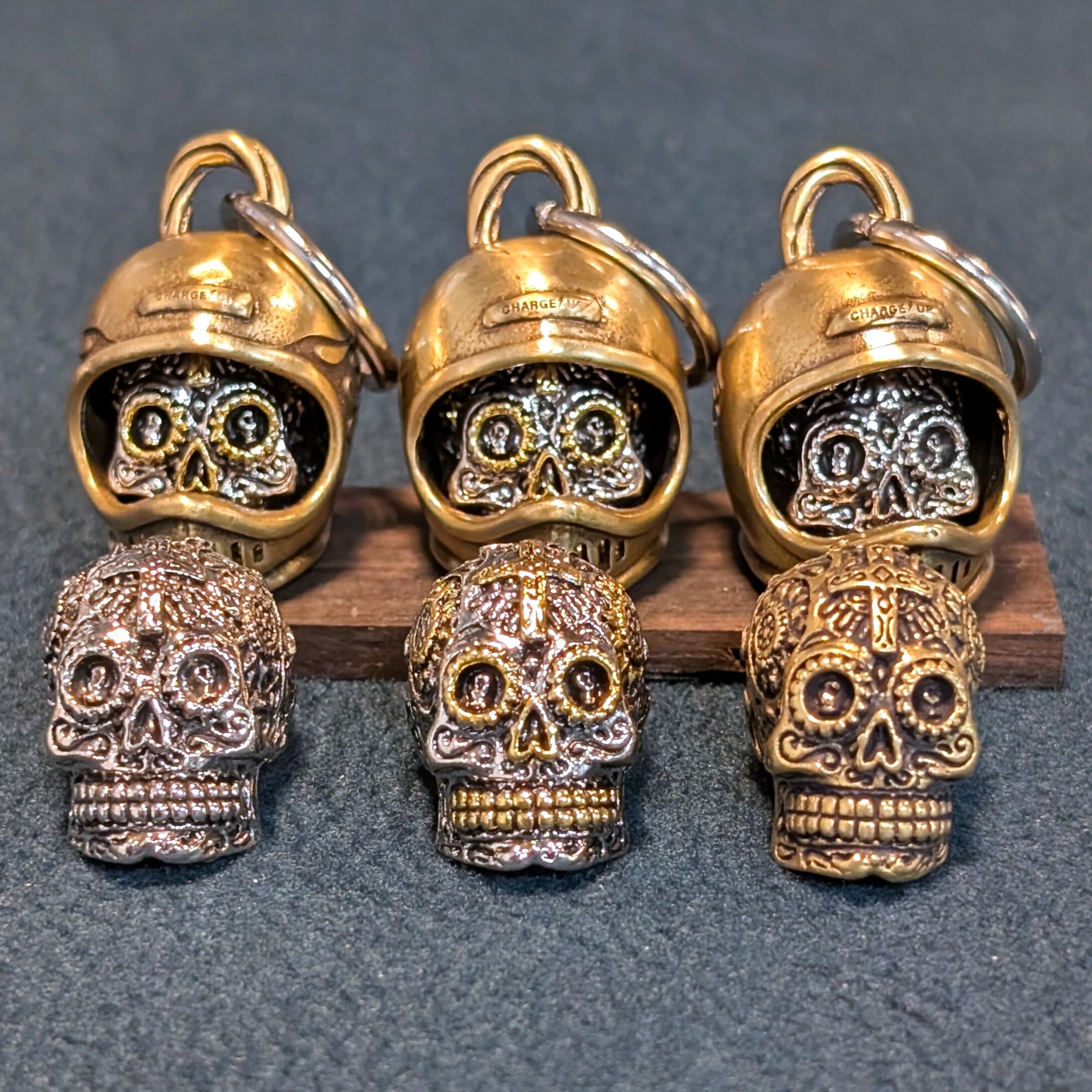 合金素材のヘルメット型チャームに可愛いピストンを全体に総柄として彫刻し、