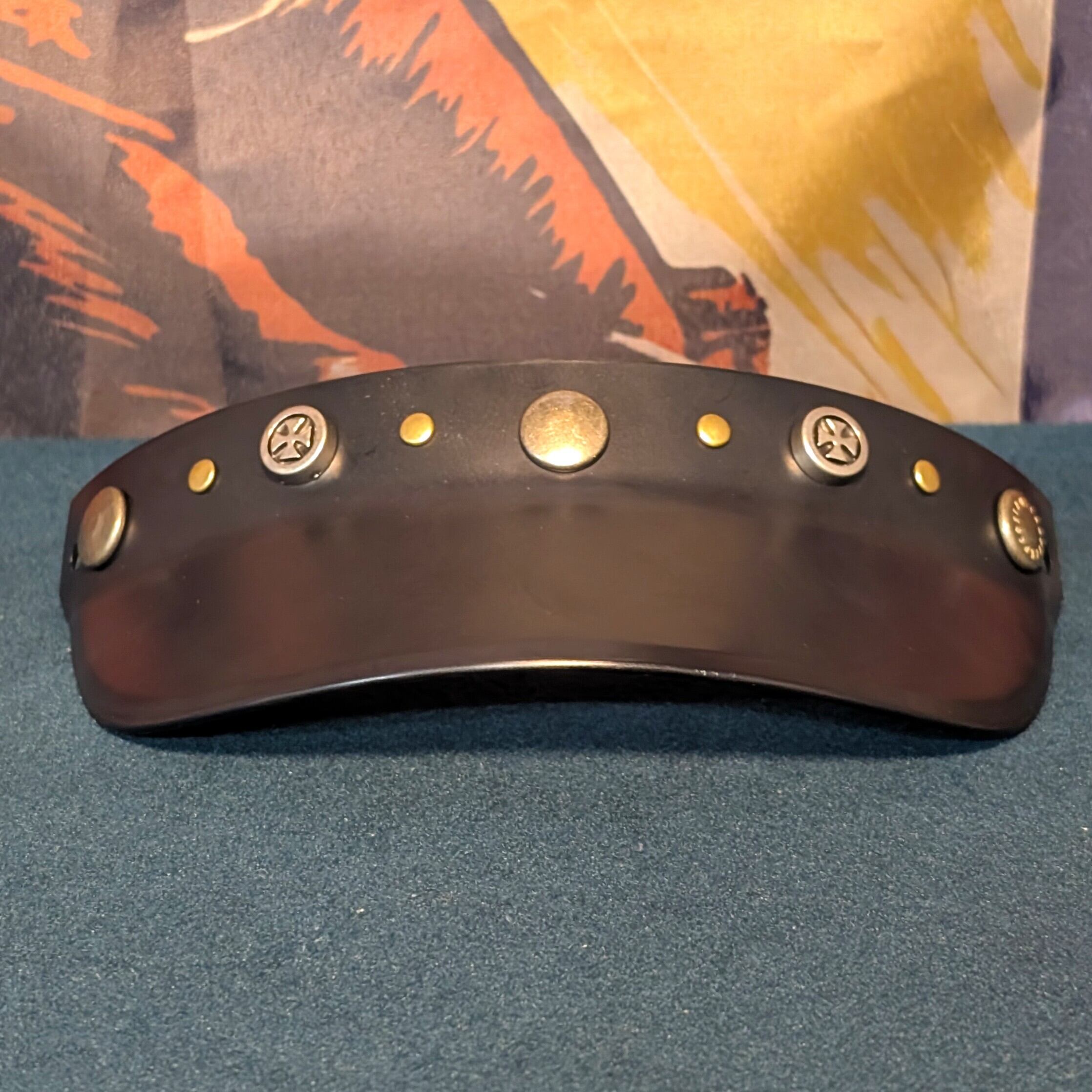 ボタンはアンティーク調を採用し、少し厚めのクロスデザインスタッズをあしらいました。