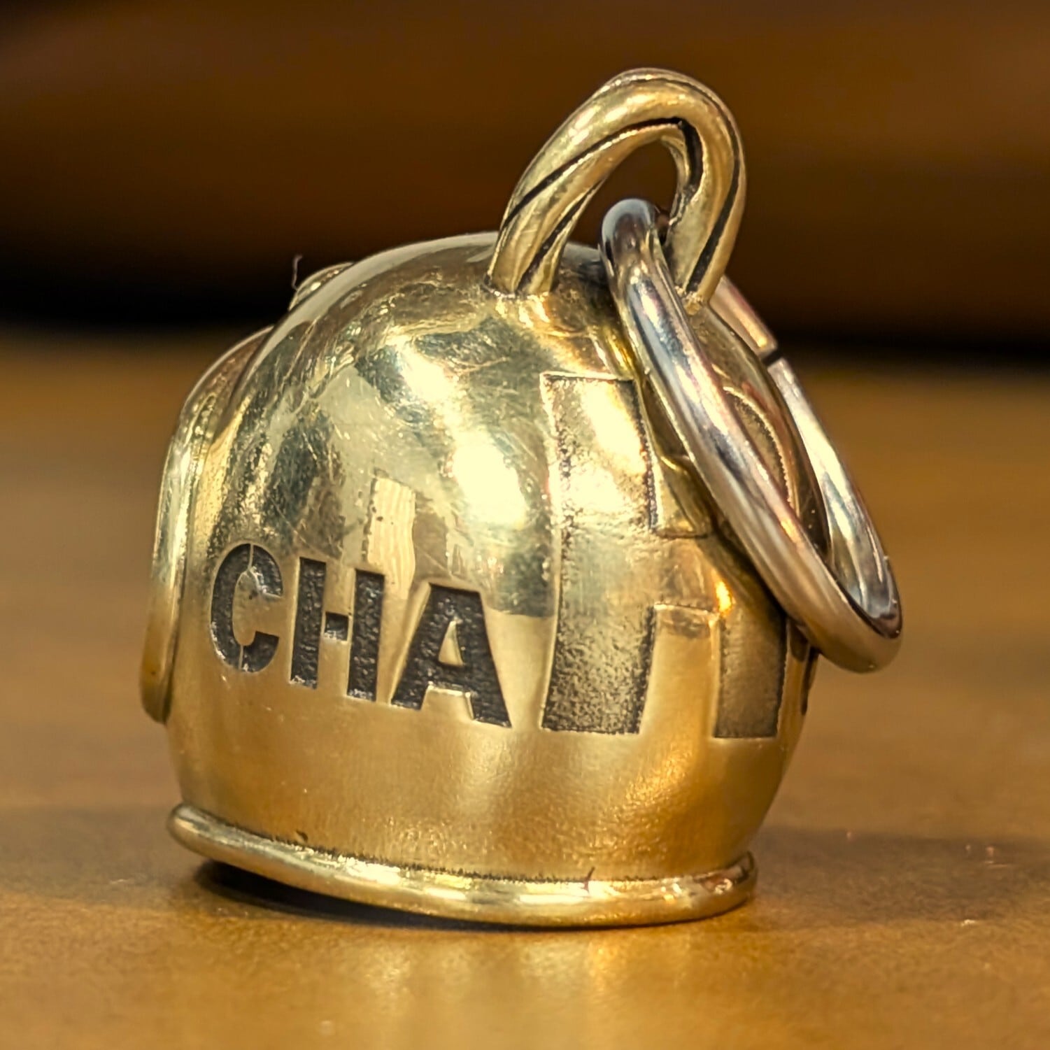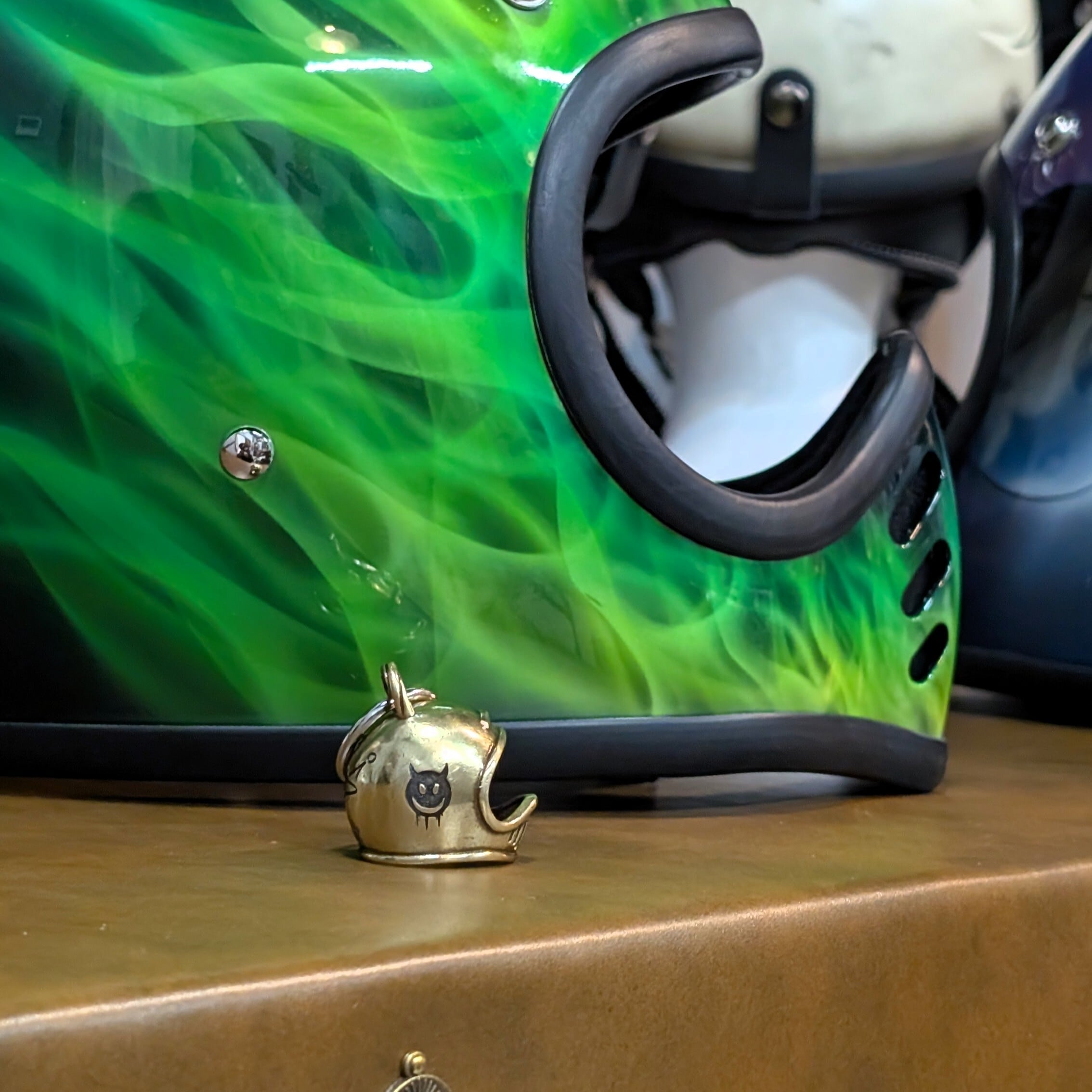 合金素材のヘルメット型チャームに当店オリジナルロゴをデカデカと刻印しました。